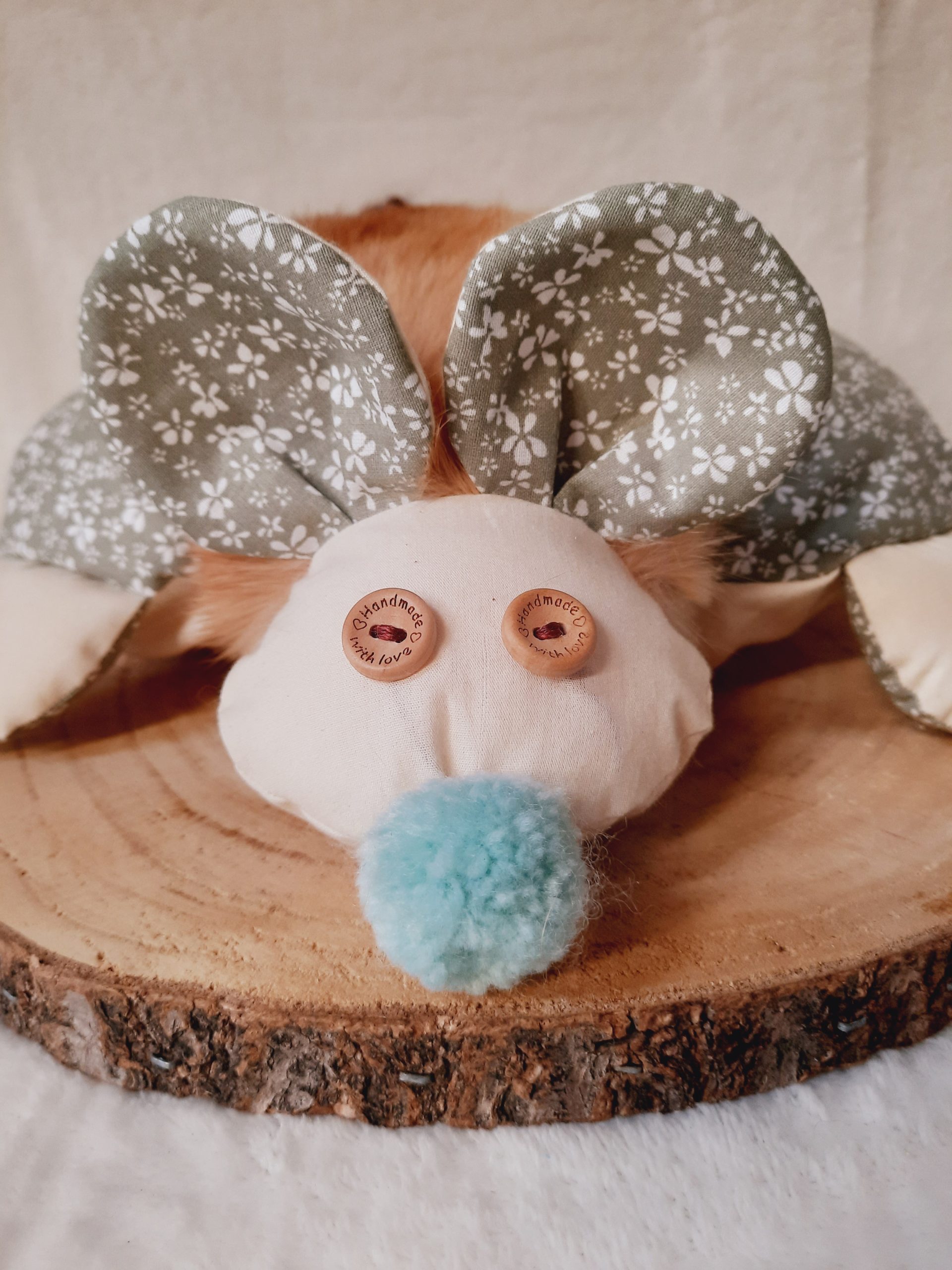 Hinter seinem süßen Gesicht wartet er nur darauf einen wilden Spielpartner zu finden. Das Kugelschwänzchen baumelt an einem Lederband an dem er sich durch die Gegend ziehen lässt. Eine knubbelige weiche Nase aus Schafwolle und Ohren aus Baumwollstoff schreien förmlich „knabbere an mir“.