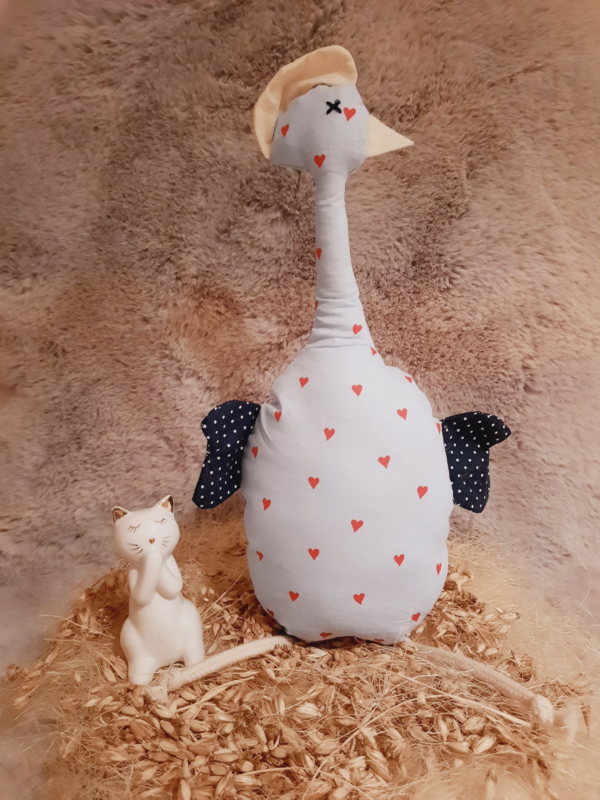 Sein langer Hals lässt seinen Kopf mit Filzschnabel und Baumwollkamm beim Tragen interessant wackeln.