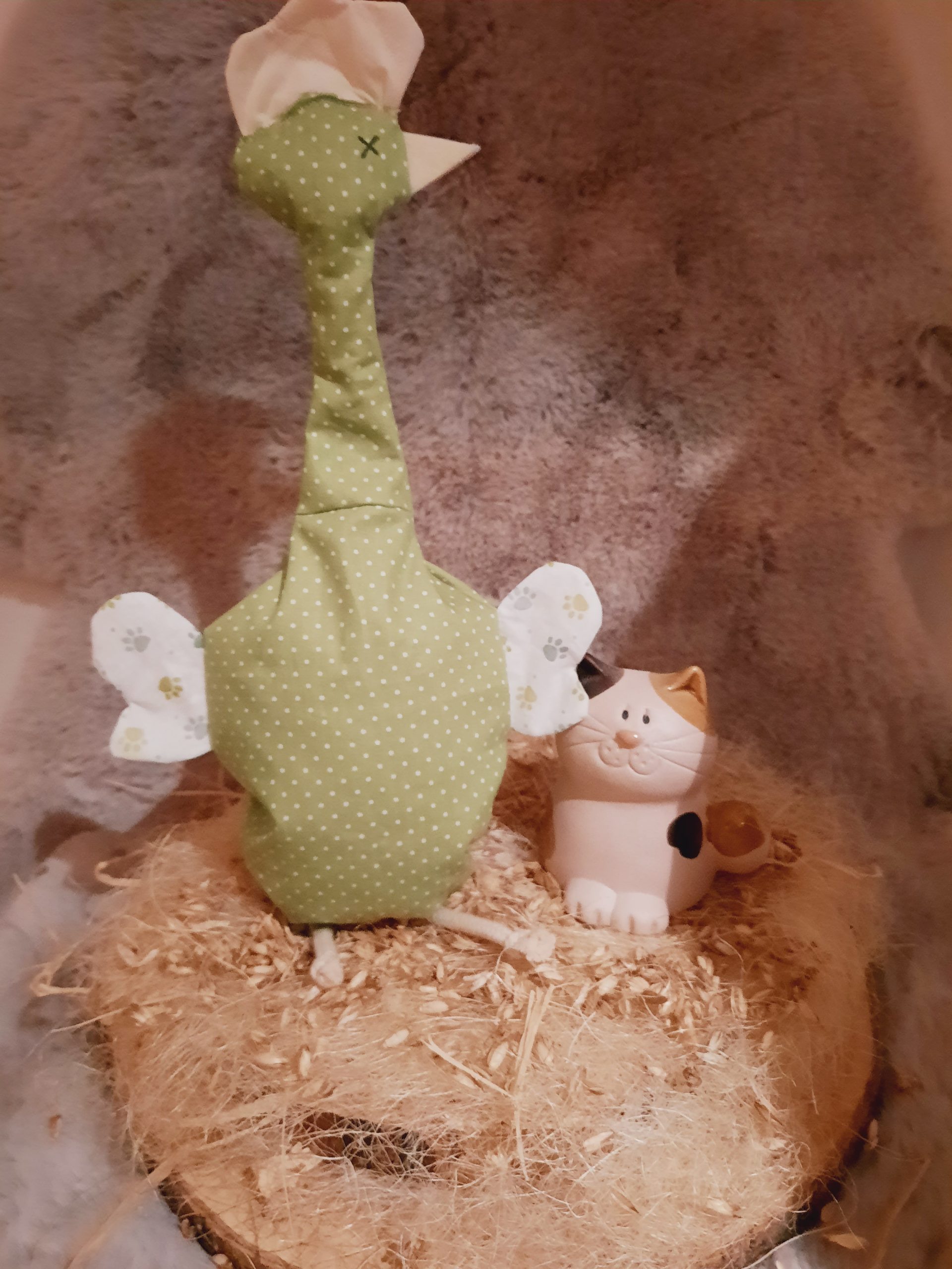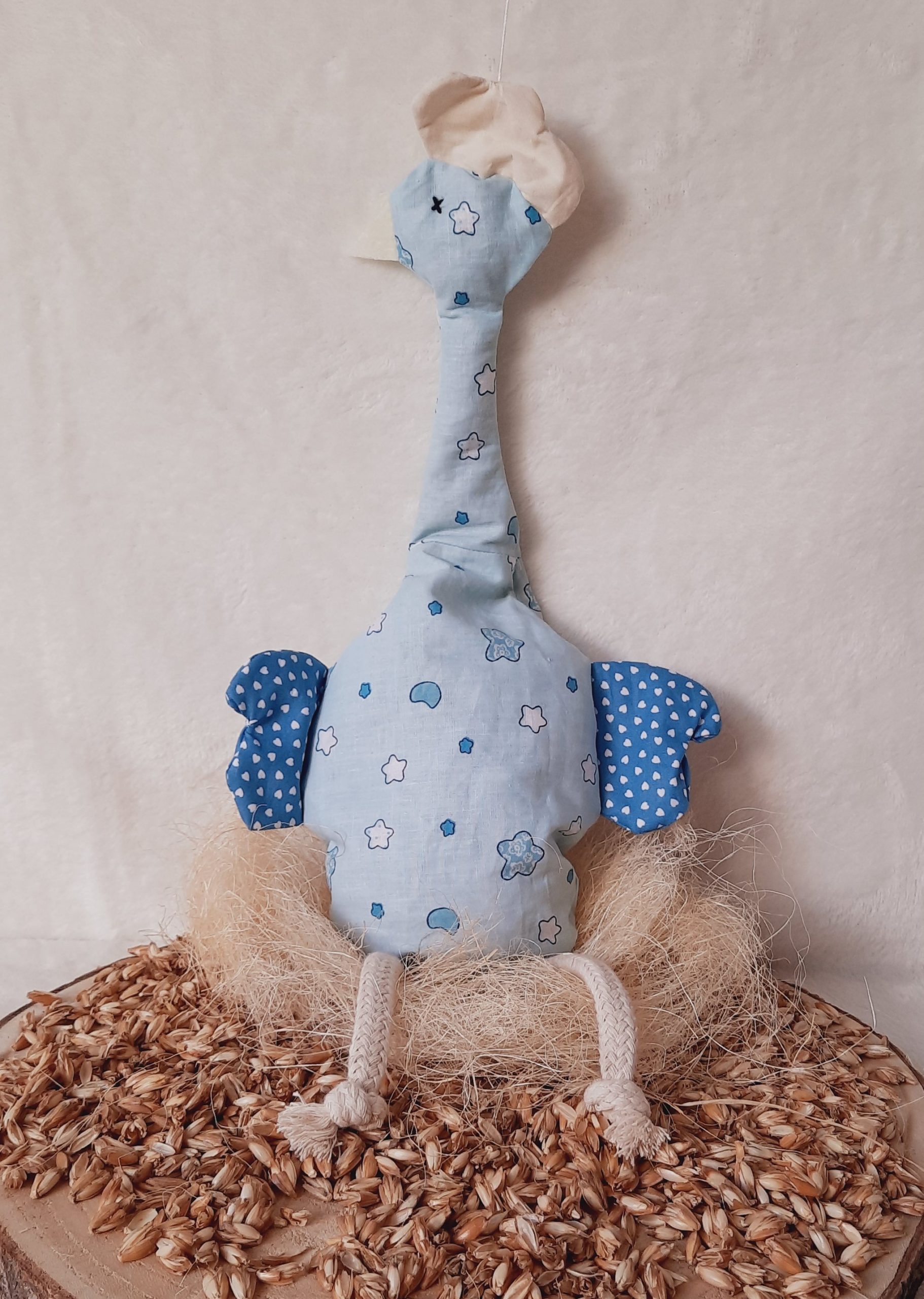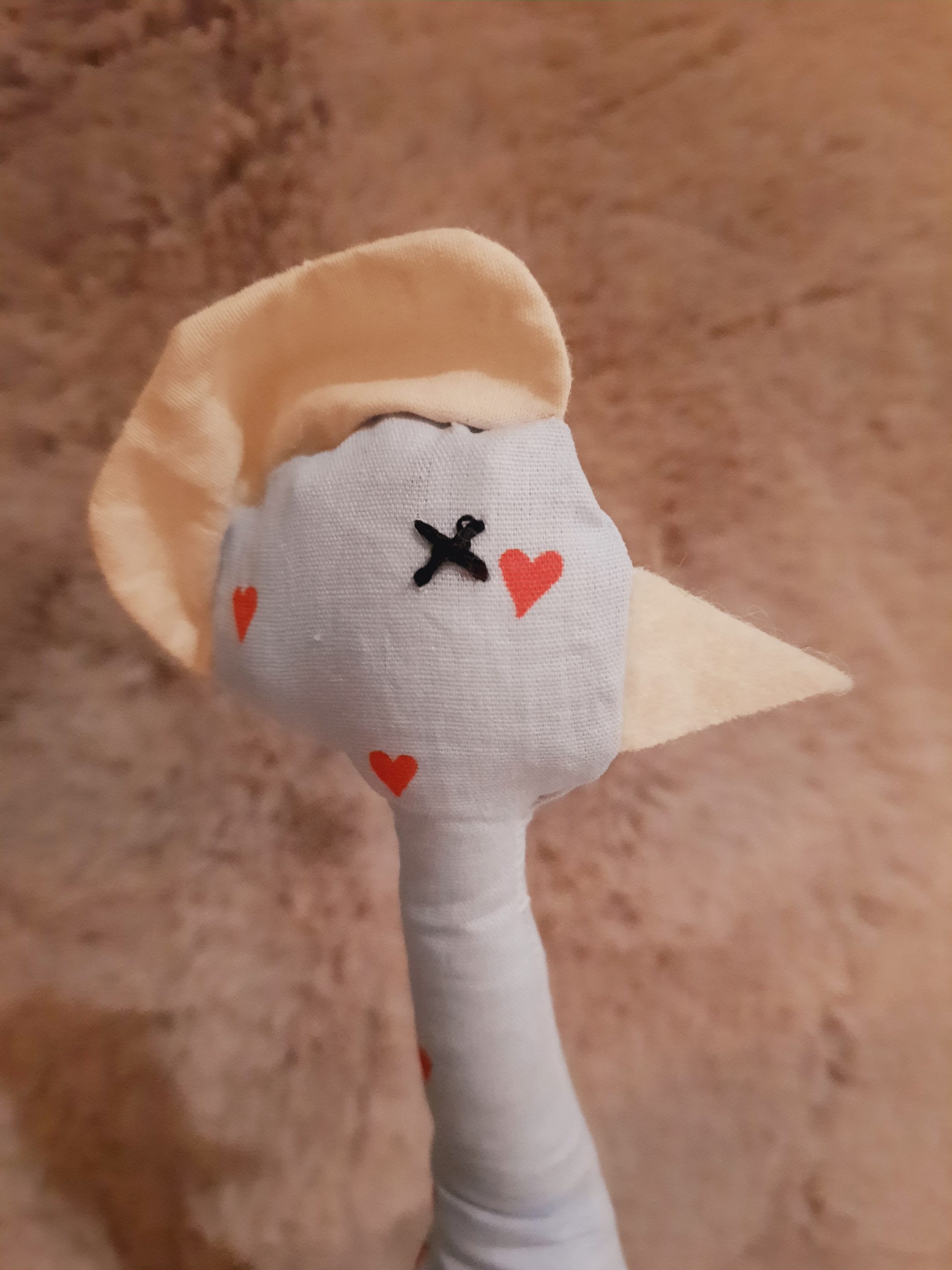 Sein langer Hals lässt seinen Kopf mit Filzschnabel und Baumwollkamm beim Tragen interessant wackeln.