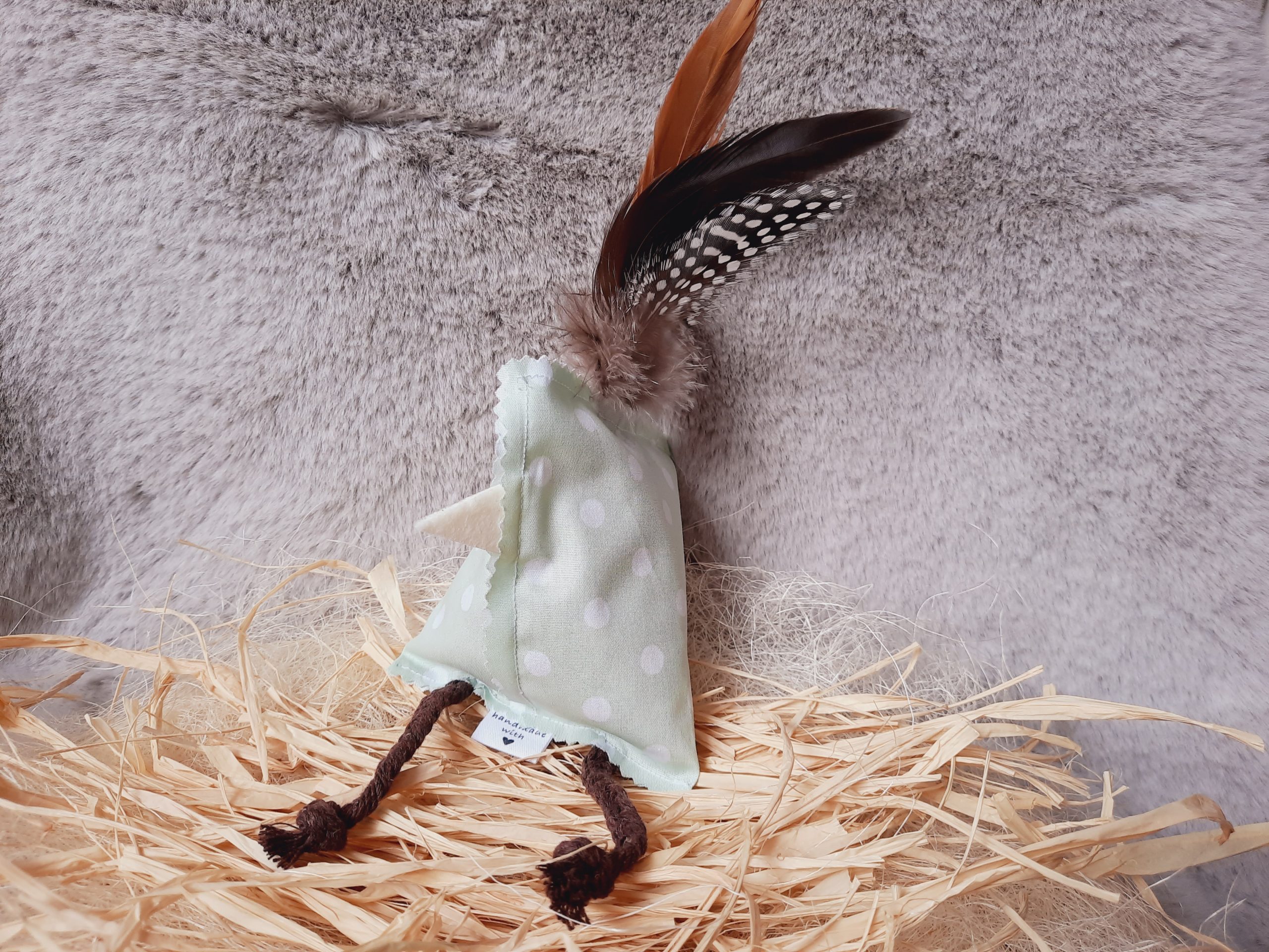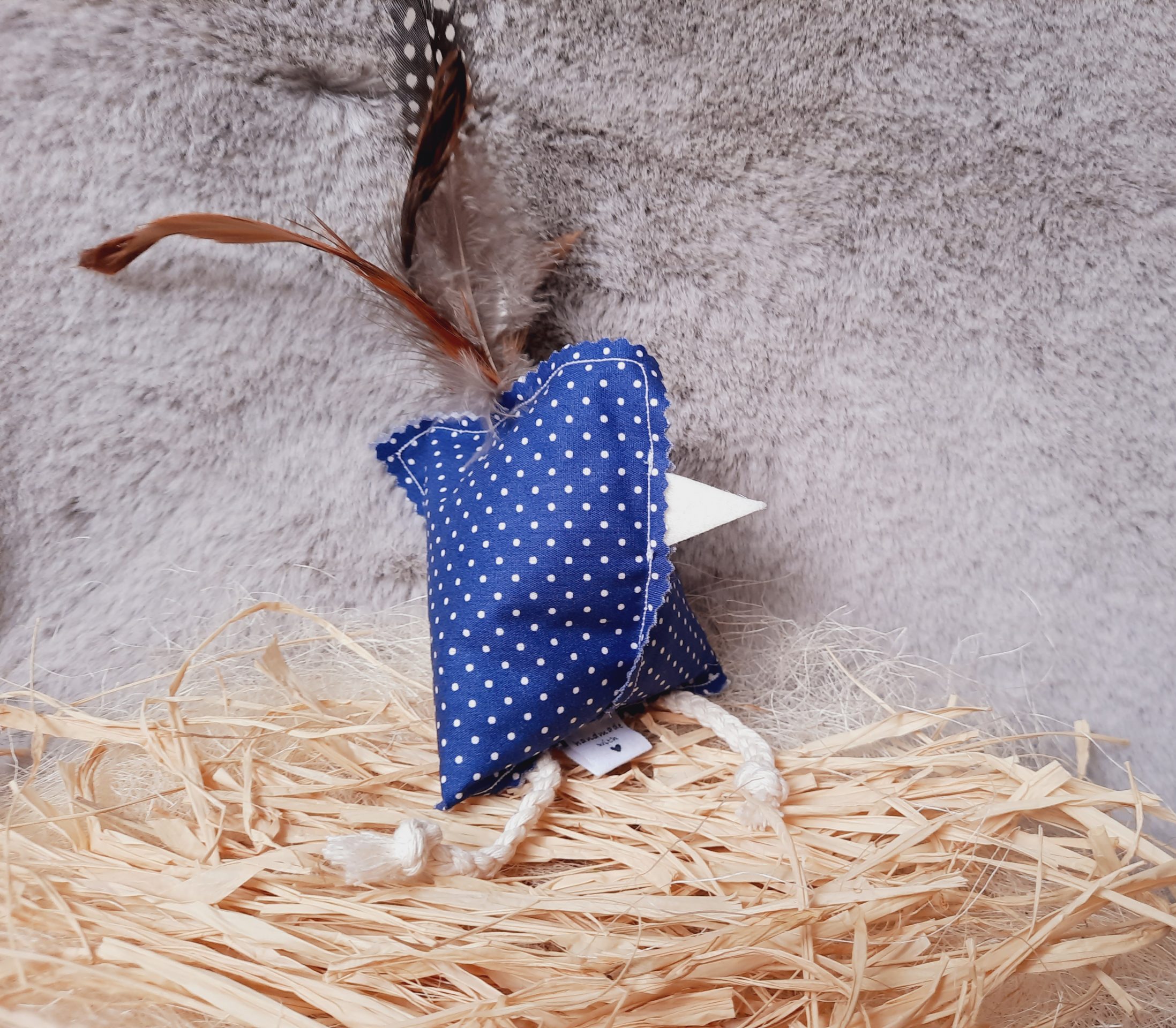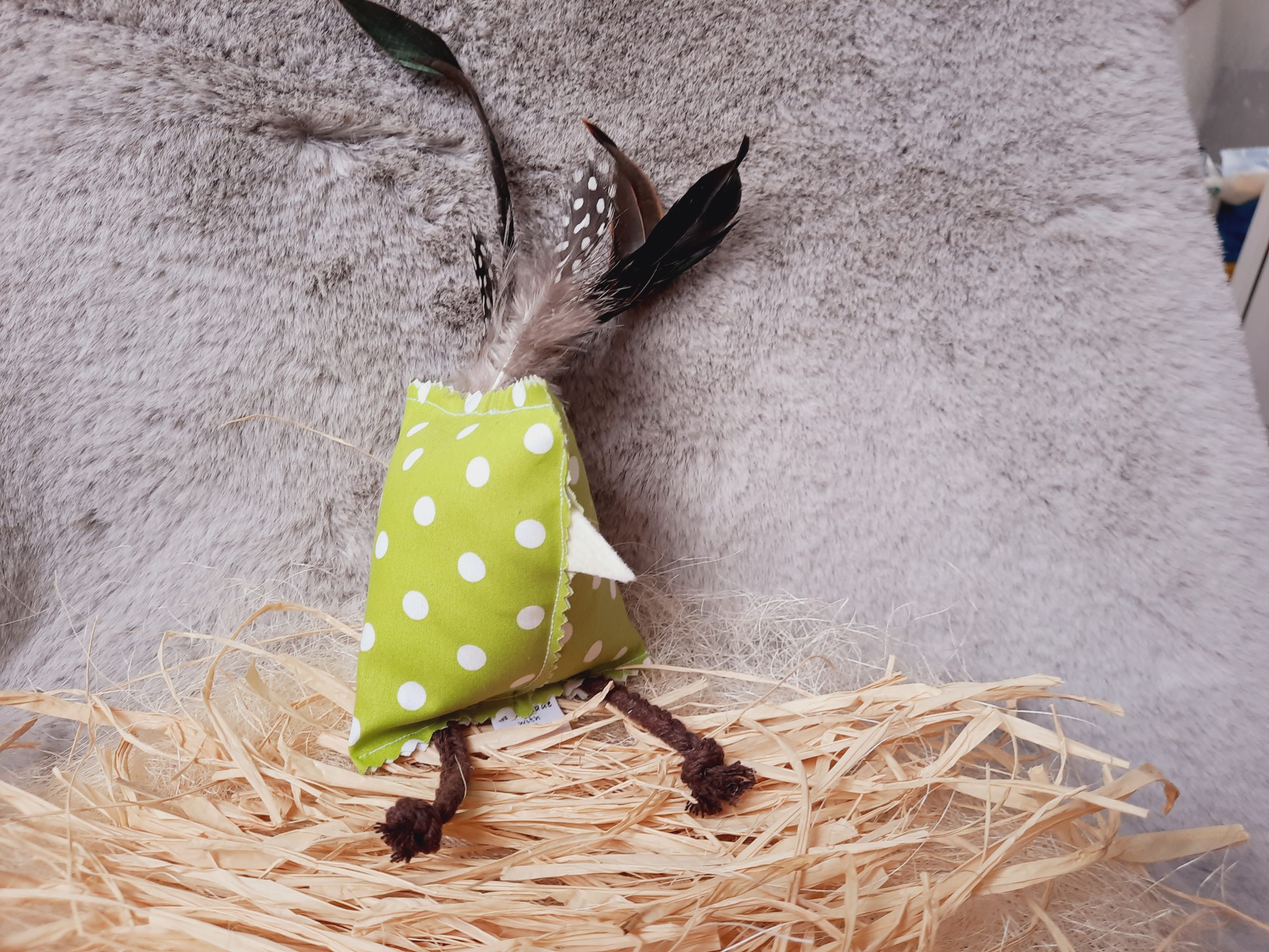 Ein besonders Katzenspielzeug aus der KiKi Familie. Die Kombination von Beinchen aus Schnüren und einem stolzen Federkamm fordern jede Katze zum spielen auf. Der Körper welcher ein “ Stinkekissen “ ist wird ungleich genäht, somit liegt das Stoffhuhn nie flach.
