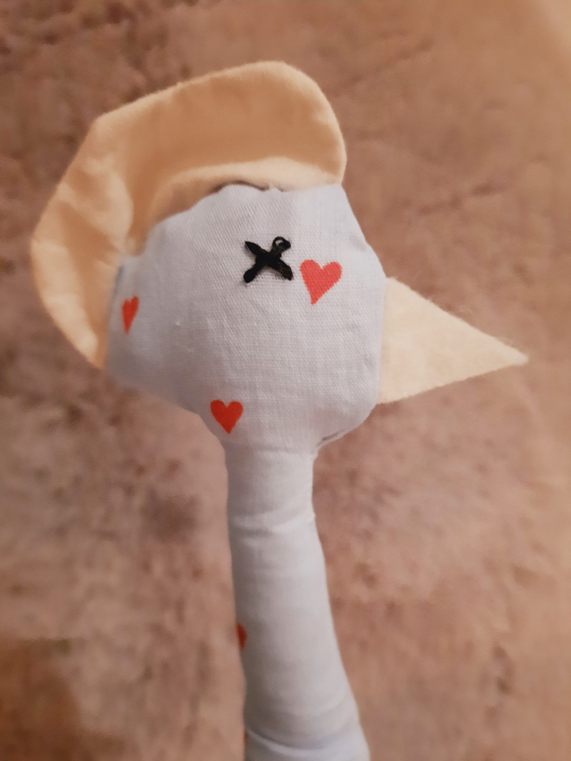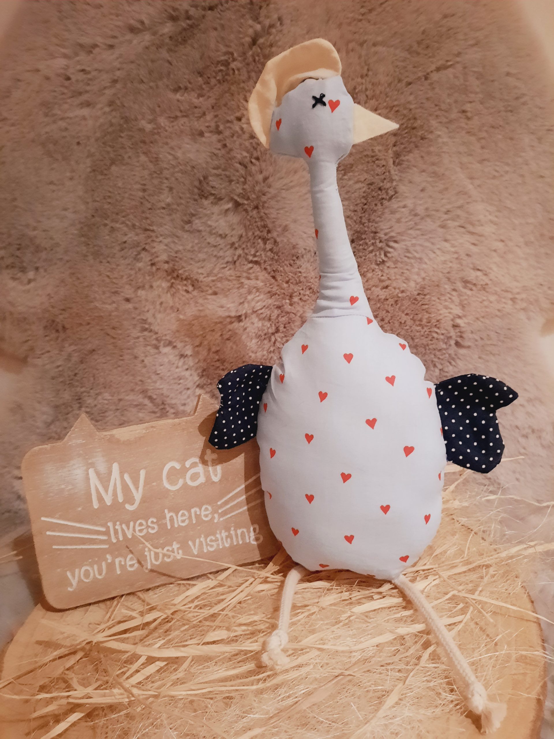 Sein langer Hals lässt seinen Kopf mit Filzschnabel und Baumwollkamm beim Tragen interessant wackeln.