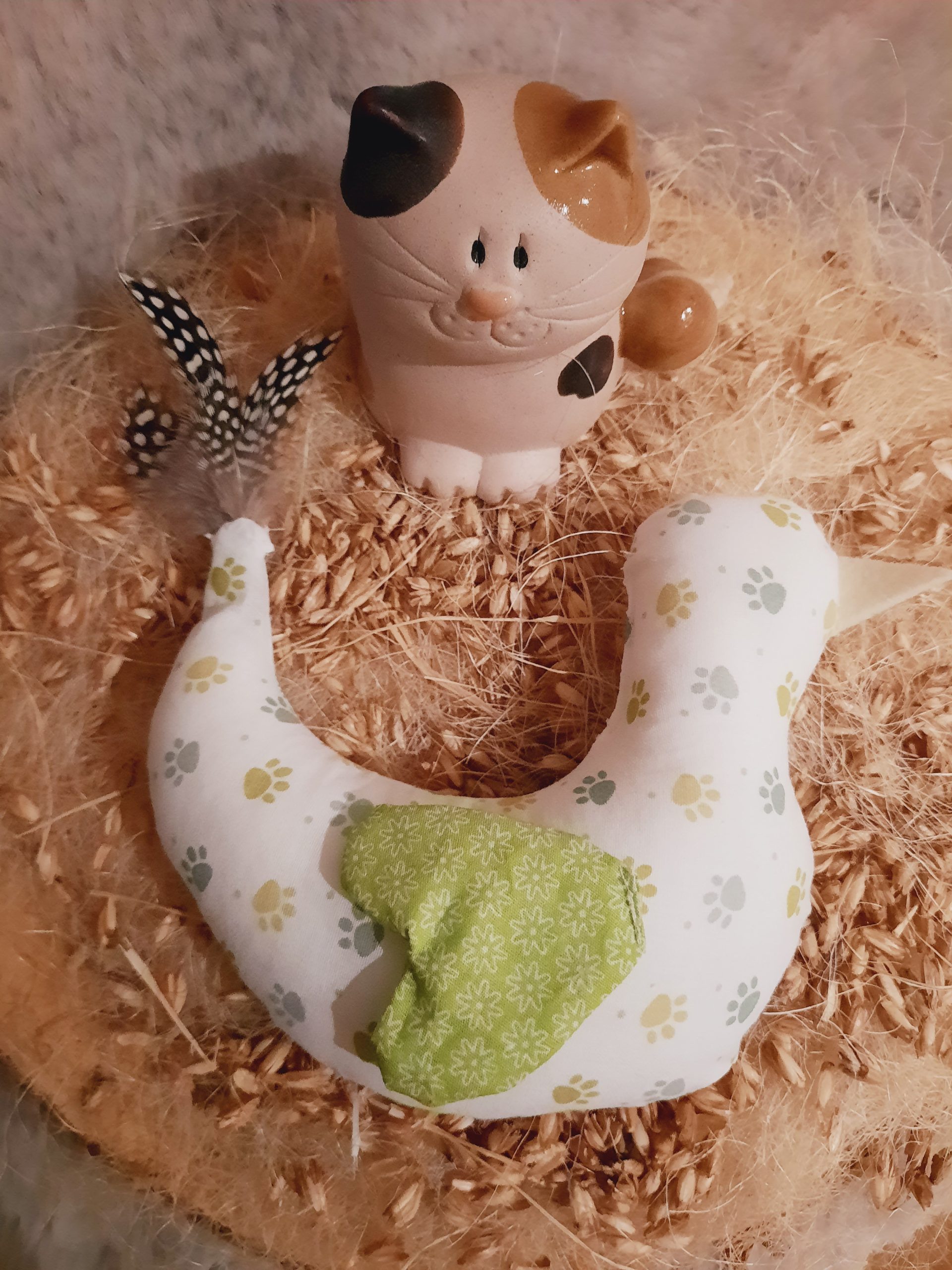 Ein besonders Katzenspielzeug aus der „Stoffvogel Familie“. Die Kombination von einem stolzen Filzschnabel und „Schwanzfedern“ fordern jede Katze zum spielen auf. Der Körper welcher ein “ Stinkekissen “ ist wird Vogelform genäht.